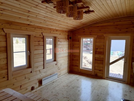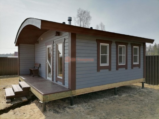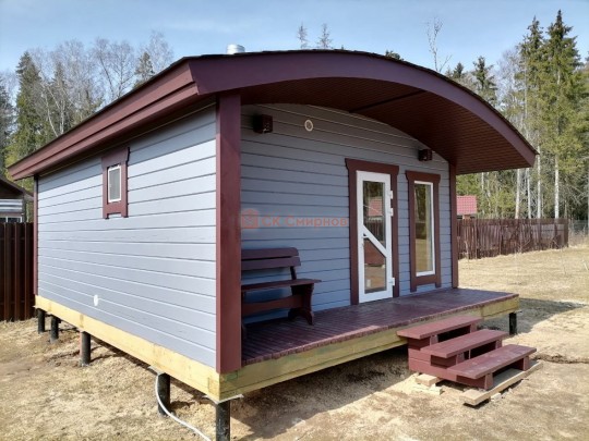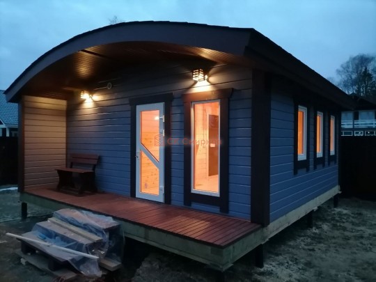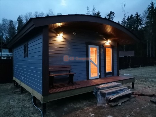 Авторские проект одноэтажной бани «Шале» с необычной округлой крышей, высокими панорамными окнами и небольшой террасой. Такую баню можно построить только из сухого или клееного профилированного бруса в комплектации под ключ. Из бруса естественной влажности и под усадку построить НЕВОЗМОЖНО.