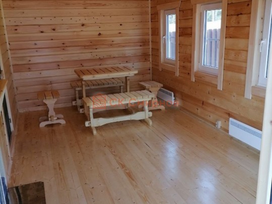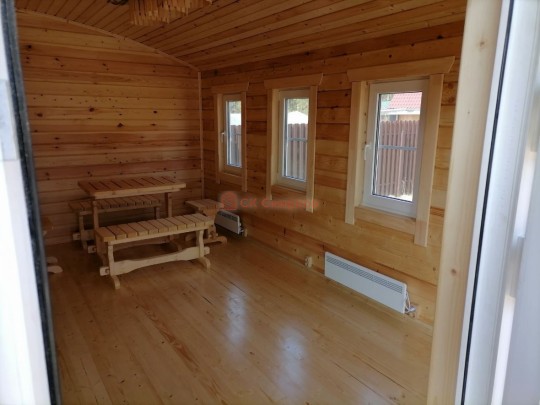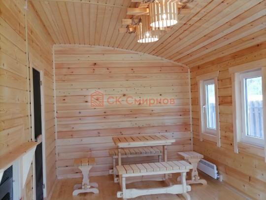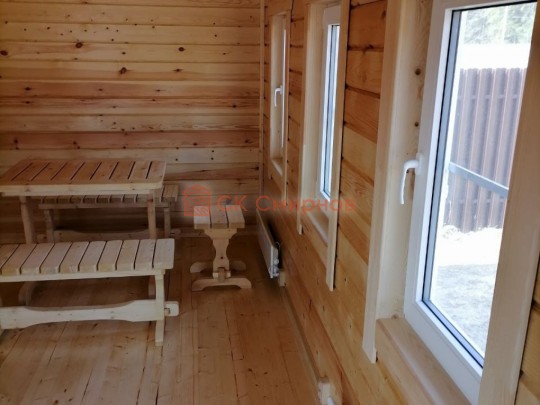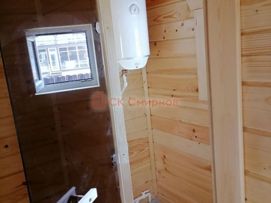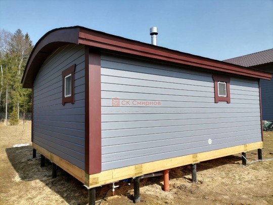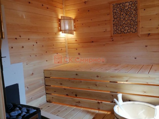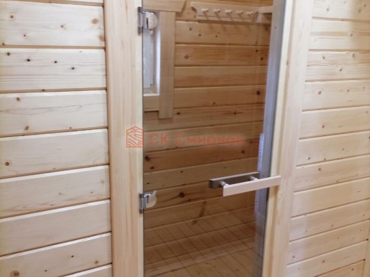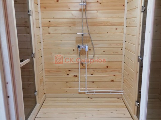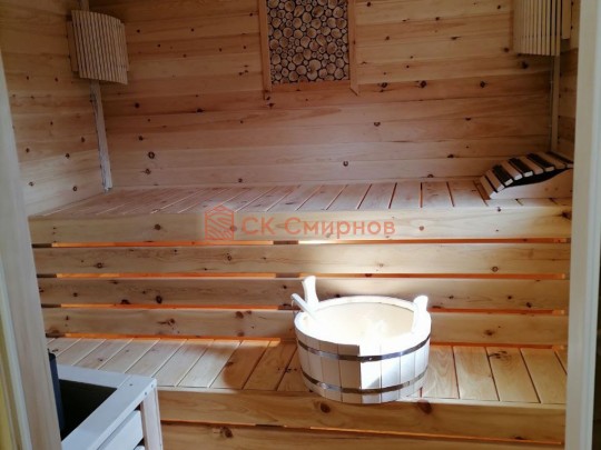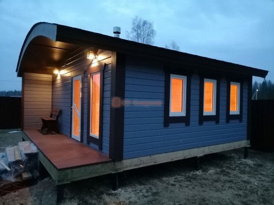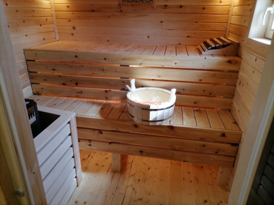 Размер 5,3 на 6 метров. Внутри 4 помещения: комната отдыха, парная, душ и санузел, где размещается душевая система. Ориентировочный срок строительства 10 дней.
